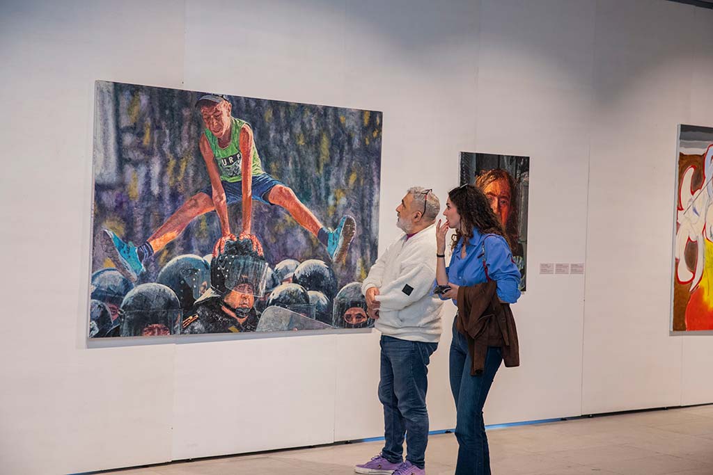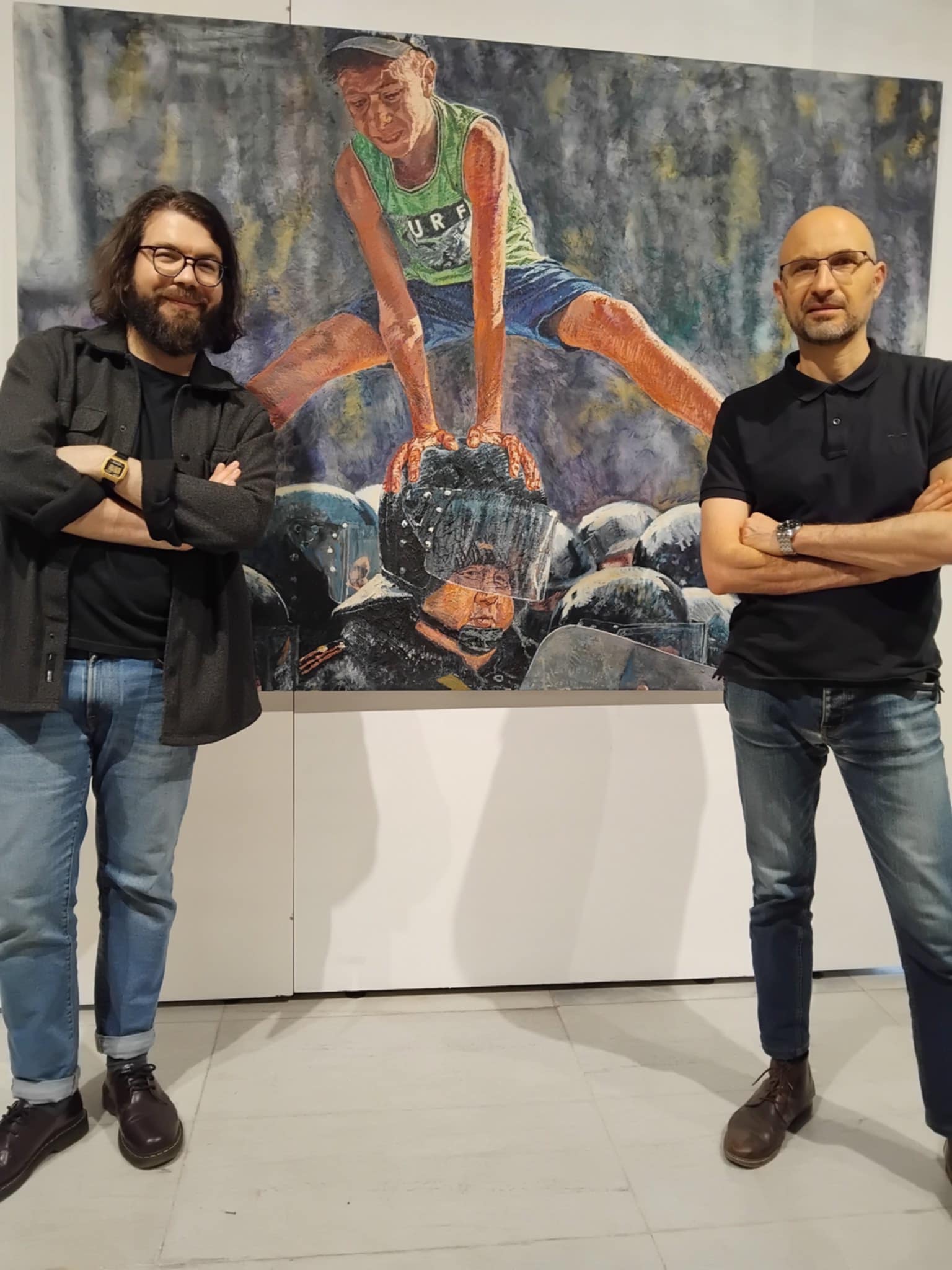 Terziev’s large-scale canvas arrests a young figure vaulting over a riot-geared officer—an act that hovers between protest and playground daring. The jumper’s vivid green shirt snaps against the deep blacks of helmets and shields, while a smoky, indistinct backdrop collapses the scene’s tension into a single, diagonal thrust.