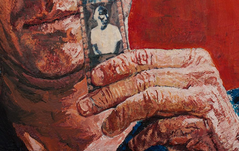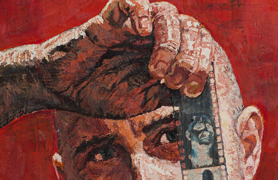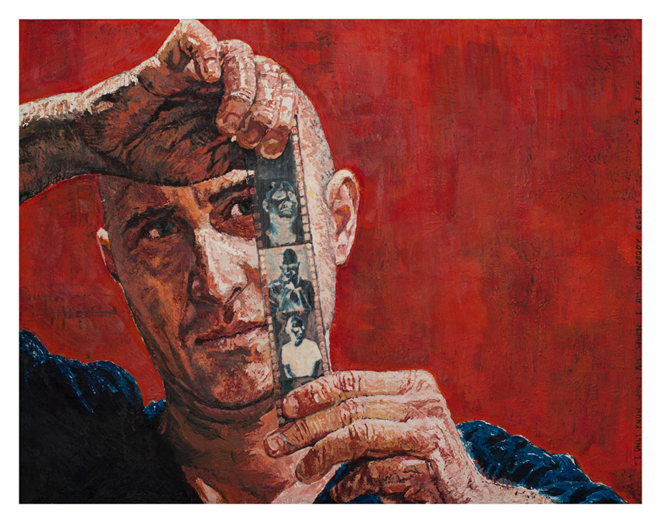 Anton Terziev’s “I Only Know Who I Am When I Am Somebody Else” is a self-portrait that adeptly explores the fluid nature of identity. Dominated by a deep red background, the painting directs our attention to the artist’s introspective gaze and the film strip he holds—an evocative device that underscores both the passage of time and the ever-changing roles we adopt. Terziev’s expressive brushwork and carefully layered textures blur the boundaries between memory and self-reflection, implying that identity unfolds gradually, much like sequential frames on a reel. The interplay between the vivid background and the meditative figure enhances the sense of inner tension, emphasizing a personal journey through recollection, transformation, and the evolving narrative of self.