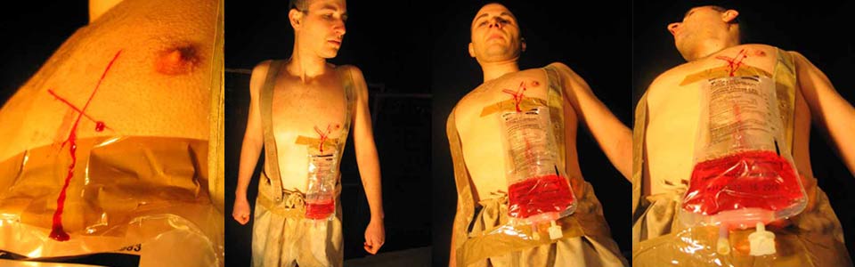 On his chest Anton Terziev makes a cut in the form of a cross. Drops of blood trickling down his body are gathering in an empty bank attached to Anton's body right at the bottom part of his chest.