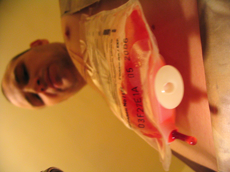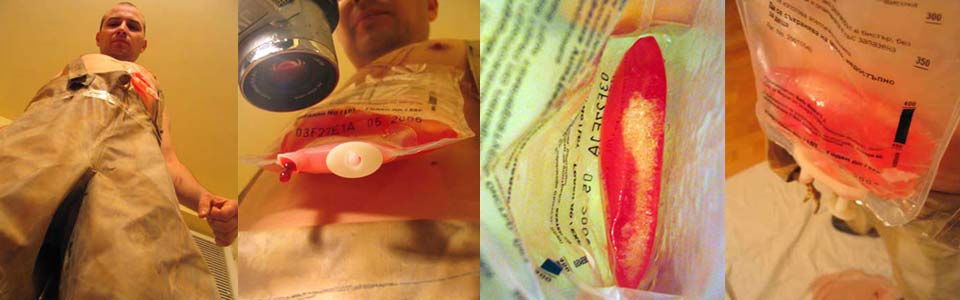 The collected quantity is frozen and used in the rest part of the performance, in which the bank is attached back to the chest above the heart, and the red lump ice melts and flows out slowly. The performance is a video-instruction about the extraction of a 'formed cruelty and the transformations of its physical conditions.