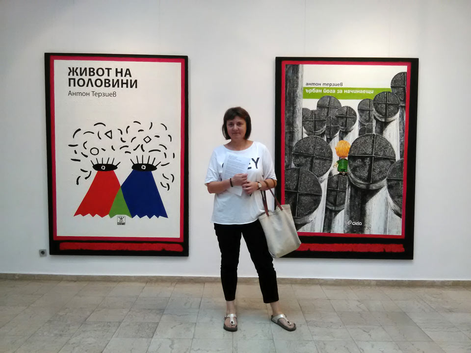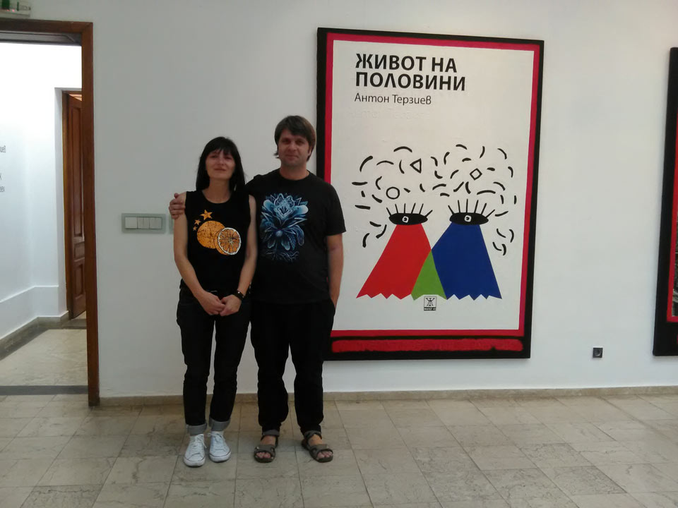 Installation view: Credo Bonum Gallery, 01.09.2016, Daniela Radeva - curator, art historian and Raicho Stanev - artist,- author of the cover of my Half Life short stories book, 2016. Foto: the author
