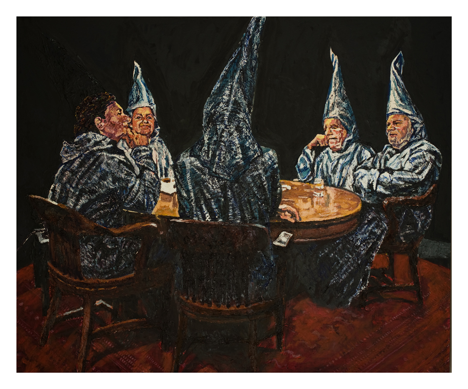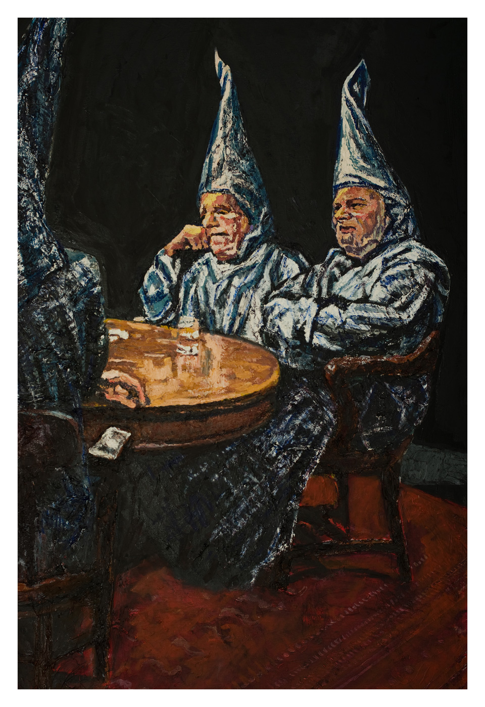In this painting, the viewer is presented with a group of individuals wearing the unmistakable garb of the Ku Klux Klan, their pointed hoods casting an oppressive shadow over the table where they sit. The figure in the foreground is caught in a moment of reflection, their hand propping up their head in contemplation, while the others seem either to be engaged in quiet conversation or lost in their own thoughts. The ominous black background amplifies the sense of isolation and secrecy, suggesting a hidden world where discussions of power, race, and privilege unfold behind closed doors.