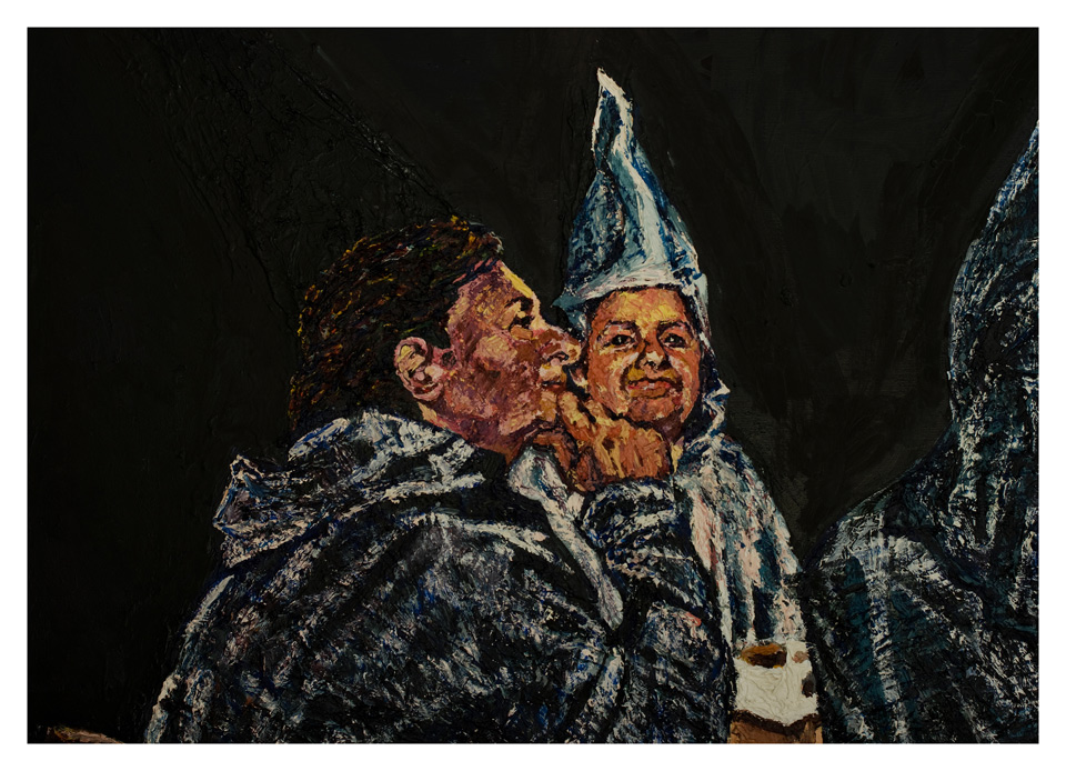 The decision to render the figures in oil with textured, heavy strokes further enhances the sense of discomfort. The figures appear almost sculptural, as though their rigid, inflexible nature reflects the unyielding ideologies they represent. The roughness of the strokes mirrors the brutality of their belief systems, a tension between form and content that reinforces the brutality of their views and actions.