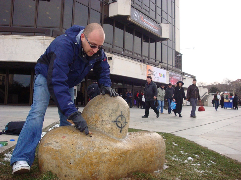 Бях оставил историята да уляга в паметта ми, когато сед- мица след авантюрата с Червен бряг се наложи да мина през НДК, за да взема баджа си за поредното издание на„Киномания“. Естествено, по навик пред централния вход хвърлих око вляво и насмалко да припадна. WTF? Моята скулптура не само че беше там, ами и сякаш никога не бе напускала пършивия чим. Буцата се върна в гърлото ми. Освен това нещо с нея не беше наред. Приб- лижих като сапьор към необезвредена мина. Върху керамиката се мъдреше рисунка на голям трибуквен атрибут, пръснат със син спрей, и надпис:„Заради 2014-а. Сори!“.