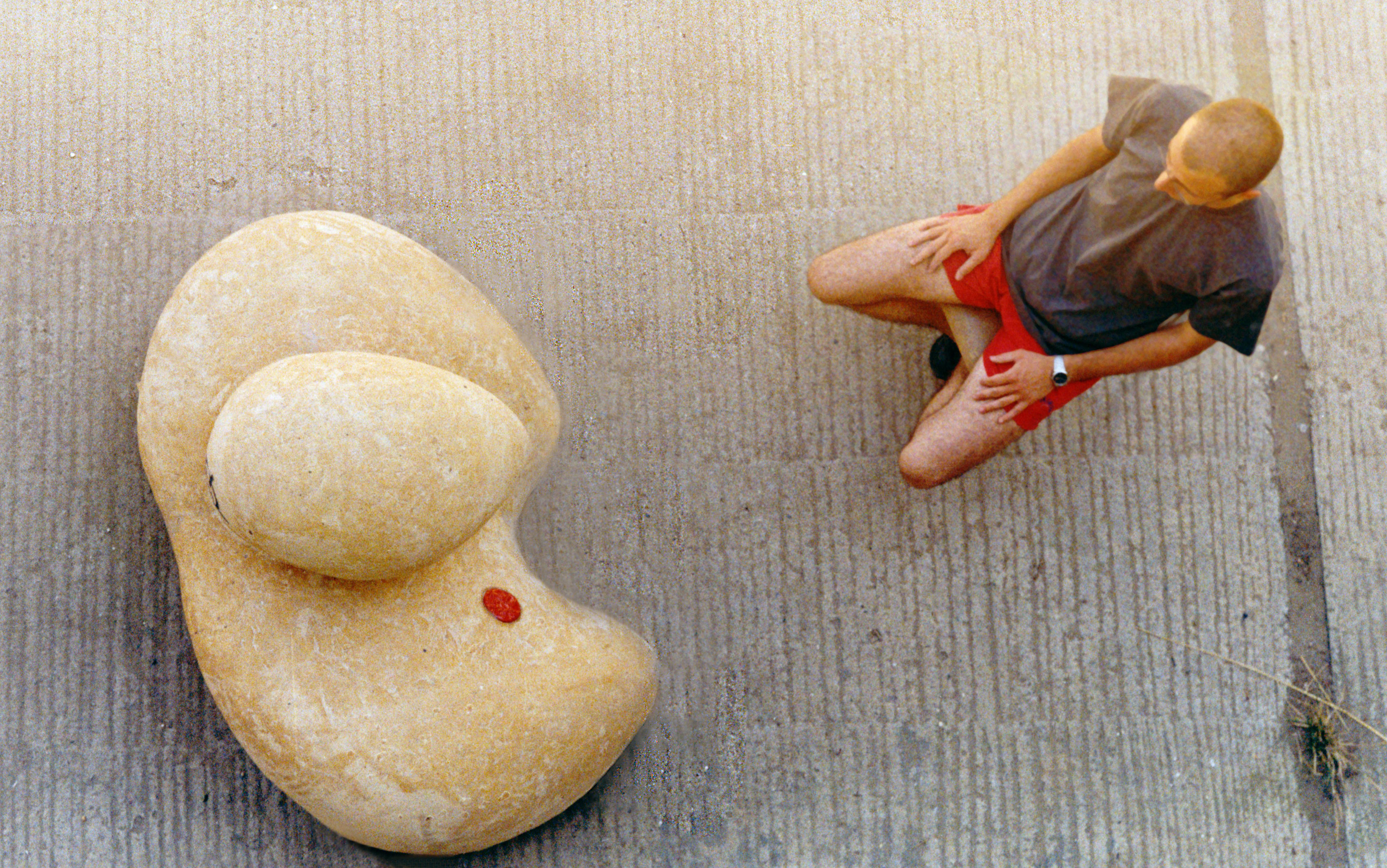 След като Love Me излезе от тунелните пещи цяла-целеничка, бях толкова въодушевен, че пресуших бутилка„Магарешко мляко“ (тогава още в стъкло) директно на гарата. Този номер не го бях правил от казармата – все пак дипломната ми по керамика беше вече готова. Оценката на моя курсов, професор Енева, ми беше важна. Откакто скулптурата е в столицата обаче, аграрният подход на тийновете към art-a силно помрачи фасона на глинения монументал. То не бе стържене със скейт, с ролери, вело трикче- та на пишман паркуристи – все отгоре . Когато минавах оттам, винаги хвърлях по едно сърдито око за оценка на щетите. Пре- ди да започне филм от„Киномания“ например, зяпах влюбените задници, които кибичеха върху„раменете“ . Виждал съм журна- листка от kafene.bg да гласи върху„твърдата мебел“ актрисата Ани Михайлова за интервю. Една грееща от щастие девойка пък веднъж ми подаде сапунерка, докато с пича пазеха равновесие върху главата на скуптурата. Сладурчета. Наместих ги със знаци малко по-вдясно, а сега малко по-вляво за по-добра композиция, нали, и снимах, какво да снобея. Това е по-добре, отколкото да напръскат трибуквен атрибут със спрей, съгласни?